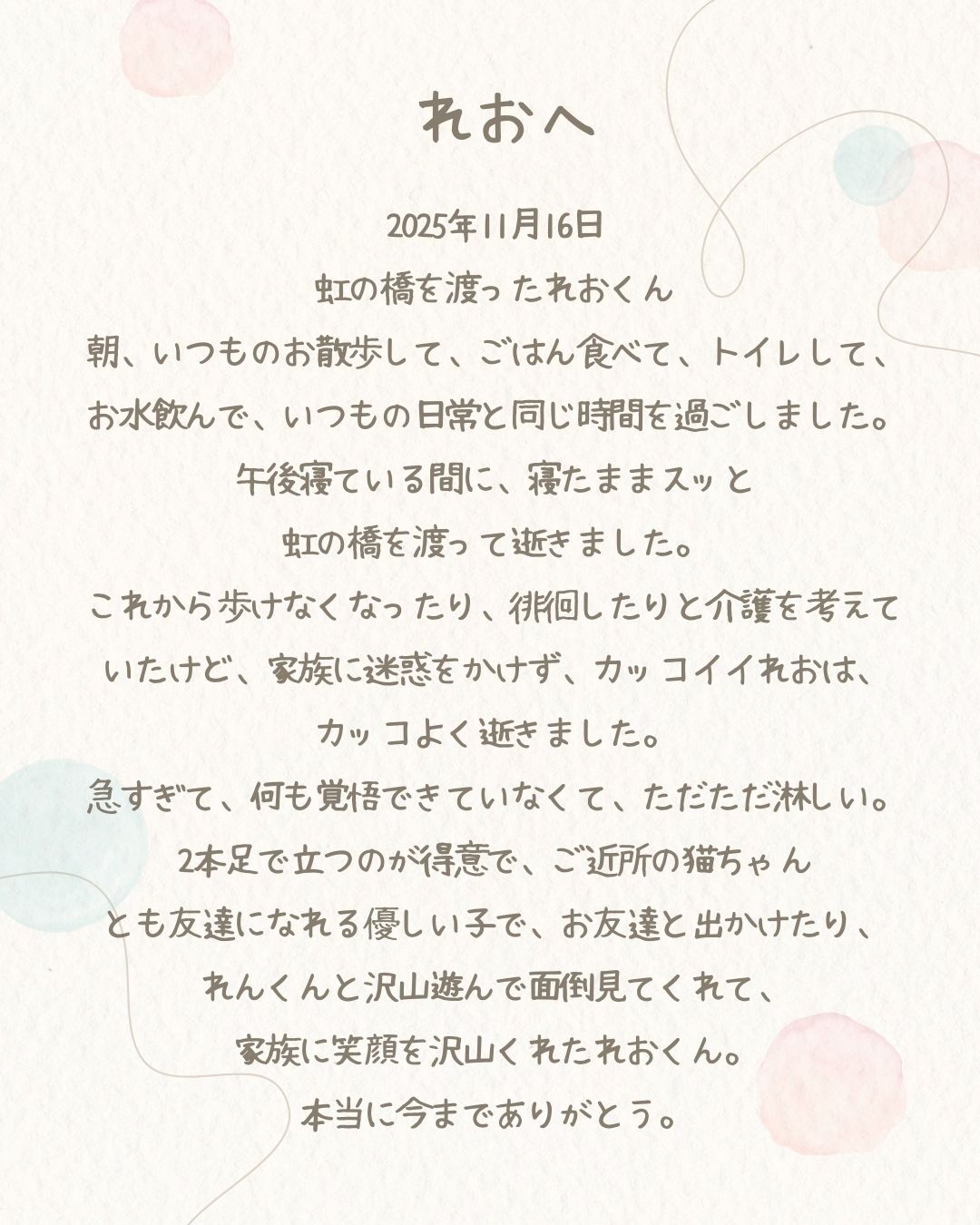 これから歩けなくなるかな、介護が始まるかな、と心配していたご家族をよそに、れおくんは最後までかっこよく、れおくんらしい最期を迎えられました。