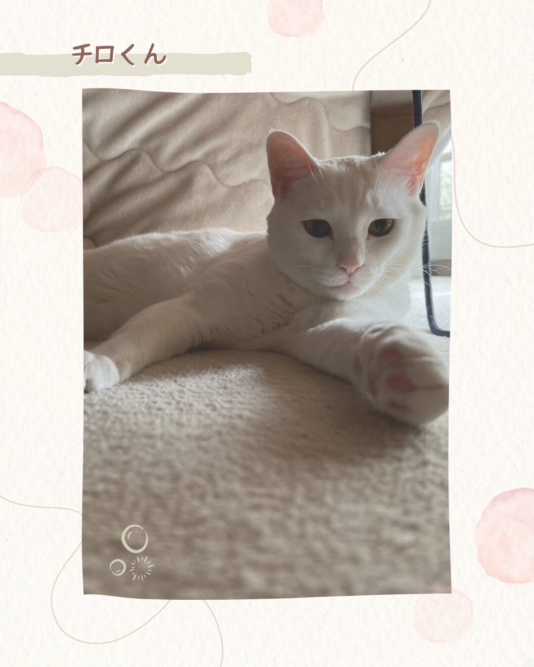 真っ白でつやつやの毛並みに、ピンクのお鼻がなんとも愛らしいチロくん。