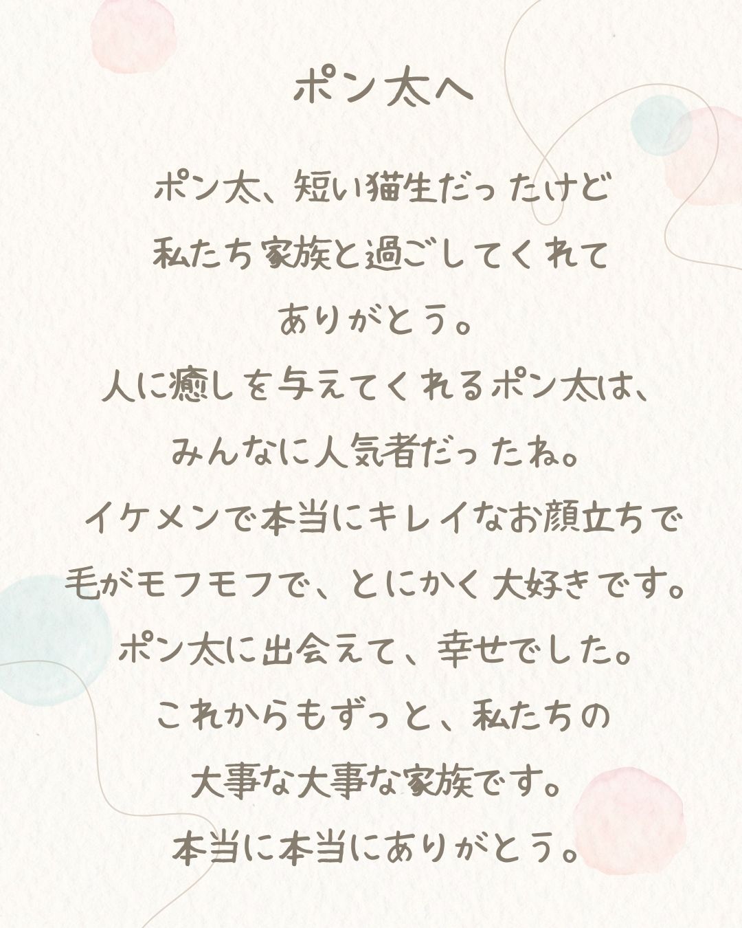 ポン太くんがいつもご家族の心の平和を守ってくれていたのかな〜と想像ができました🌿