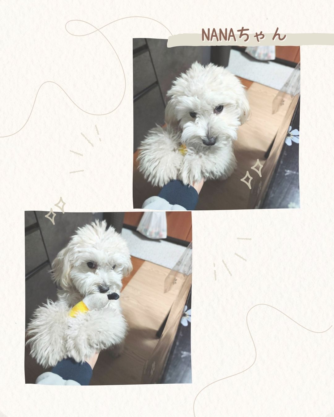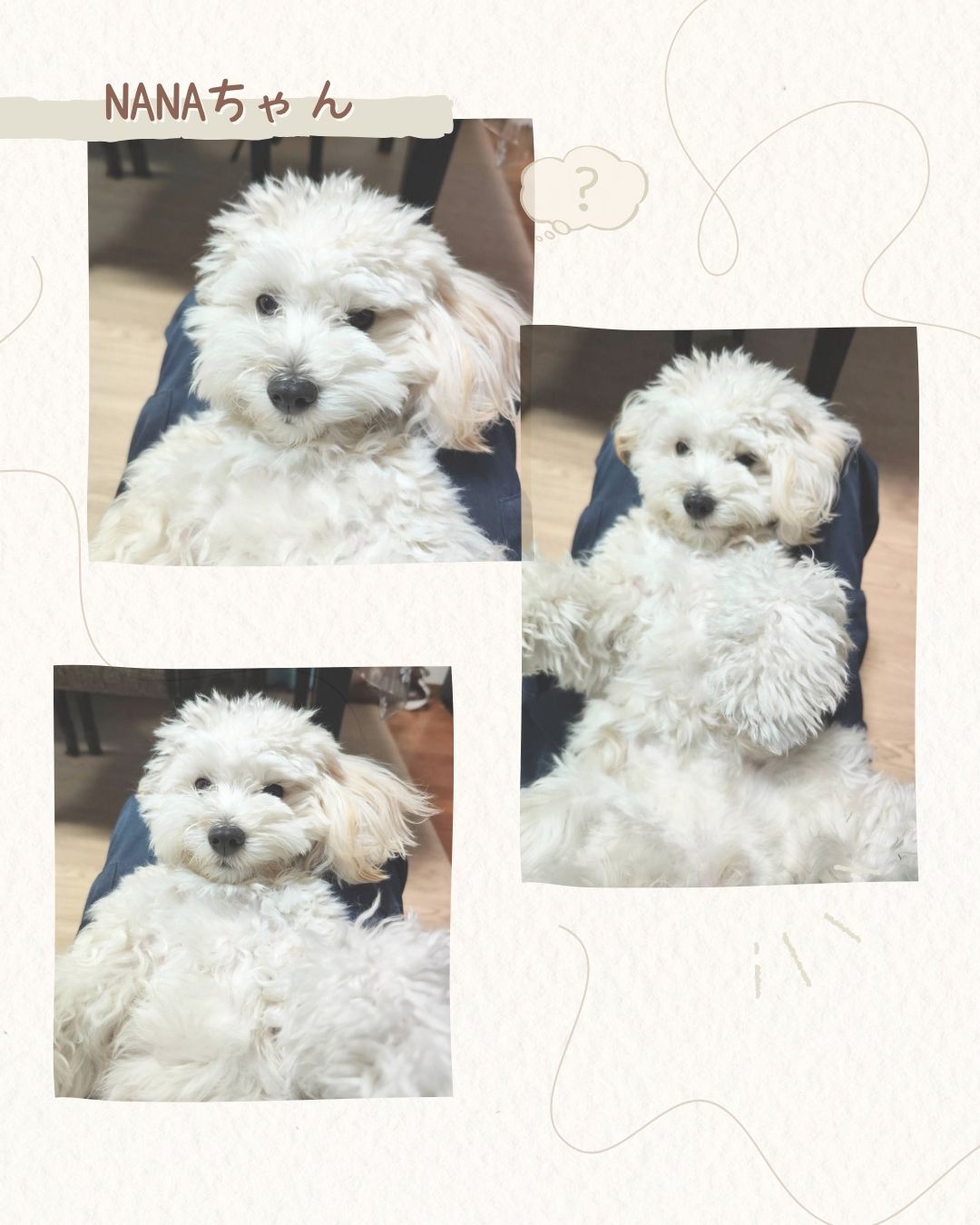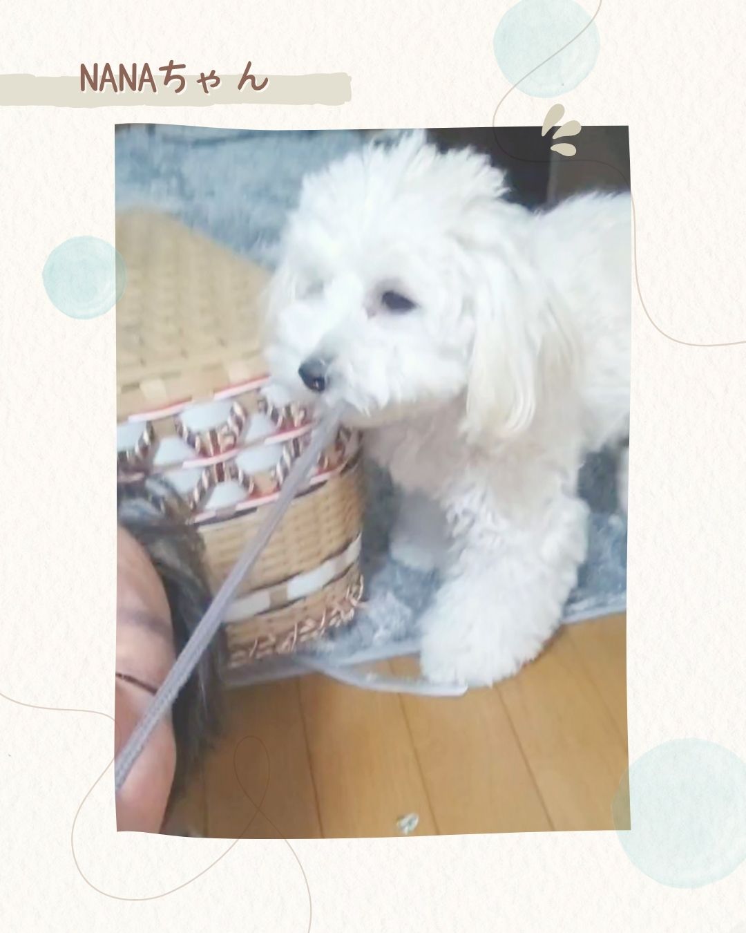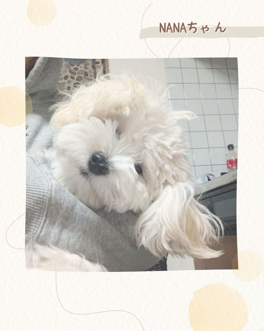 真っ白でふわふわな毛に、愛らしいクリっとした目が可愛いマルチーズとシーズーのMIX犬、ななちゃん。